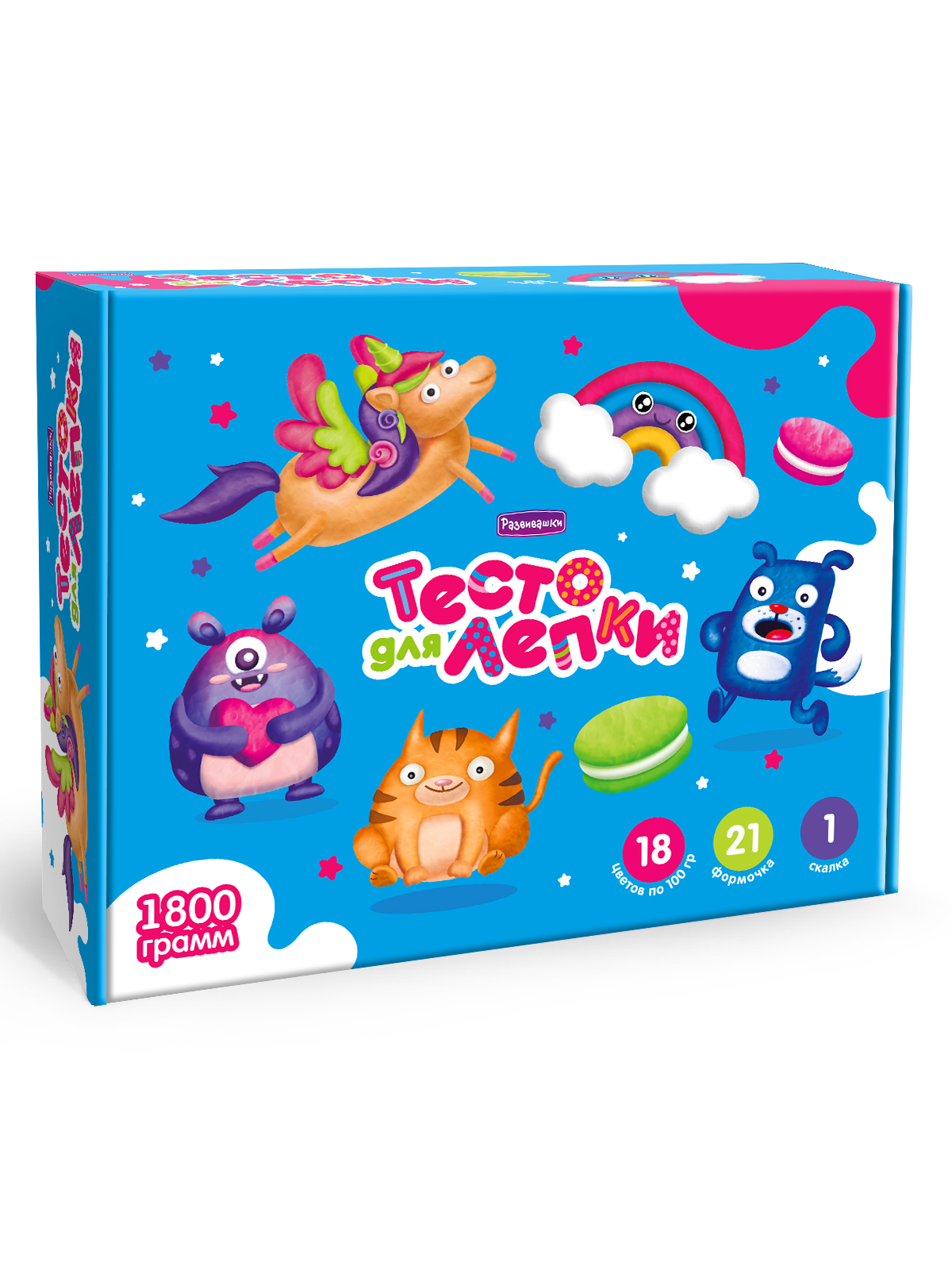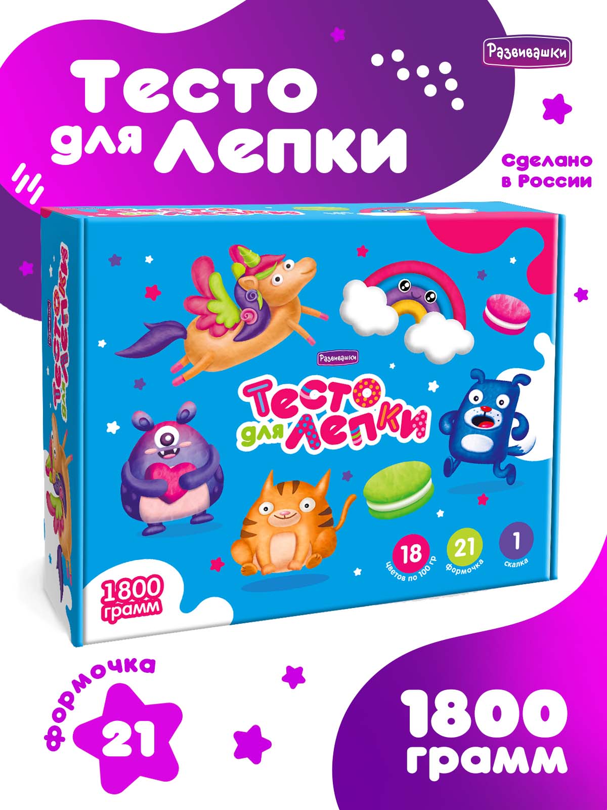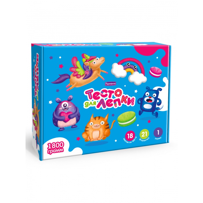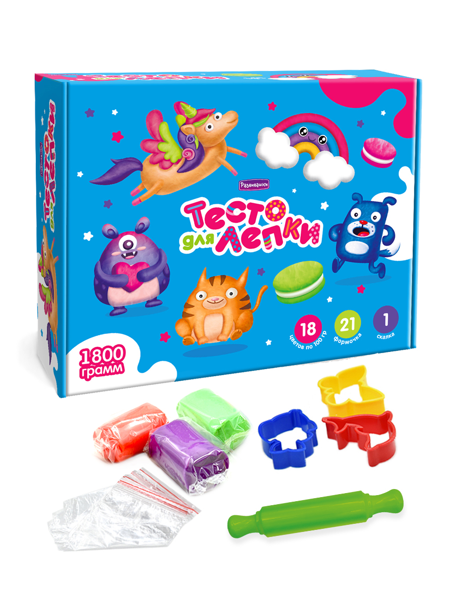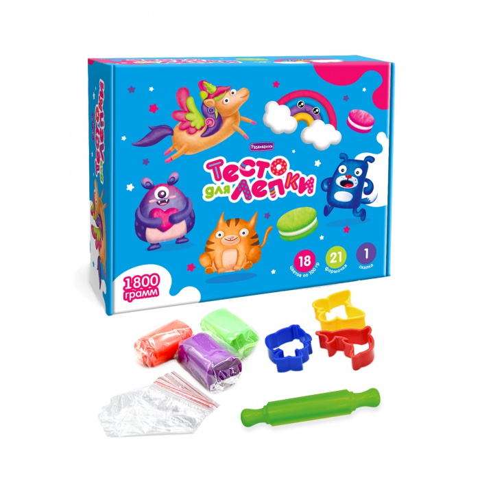 Home Тесто для лепки П133 Тесто для лепки в коробке, тесто 1800гр, 18 цветов, 21форма, скалка, 1/5