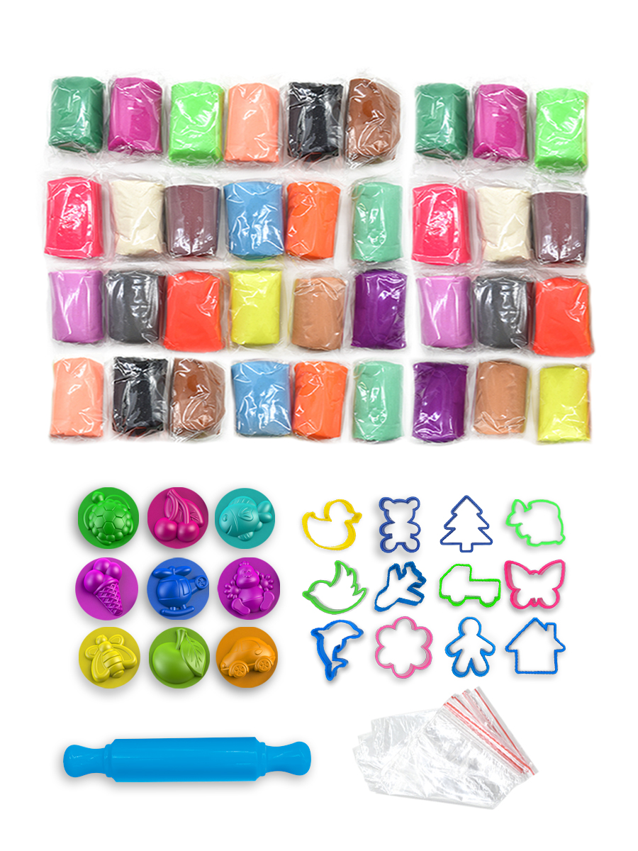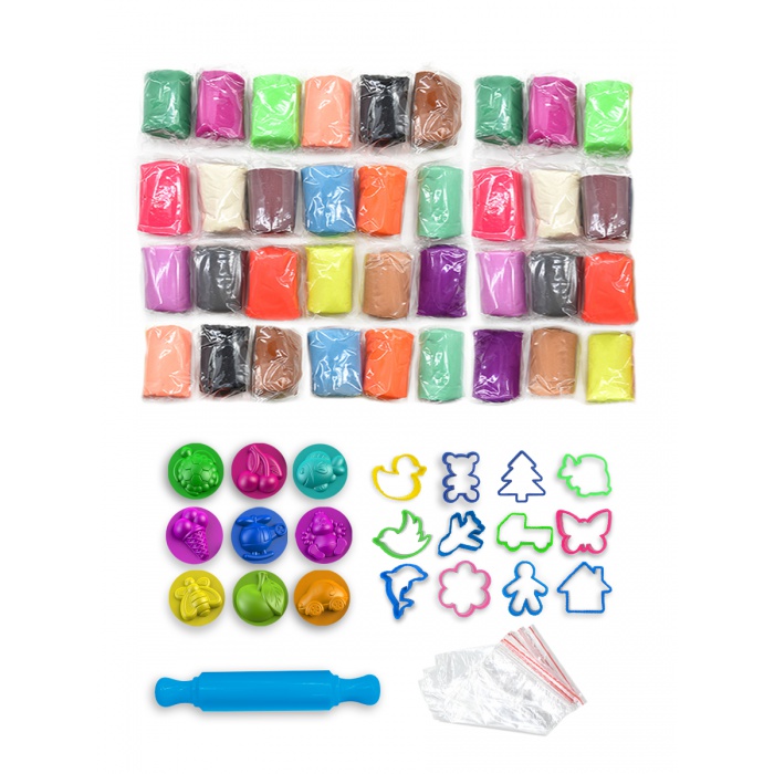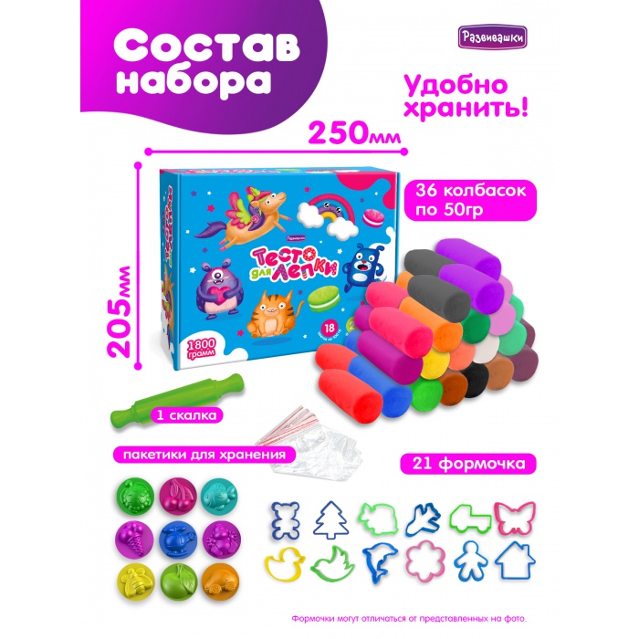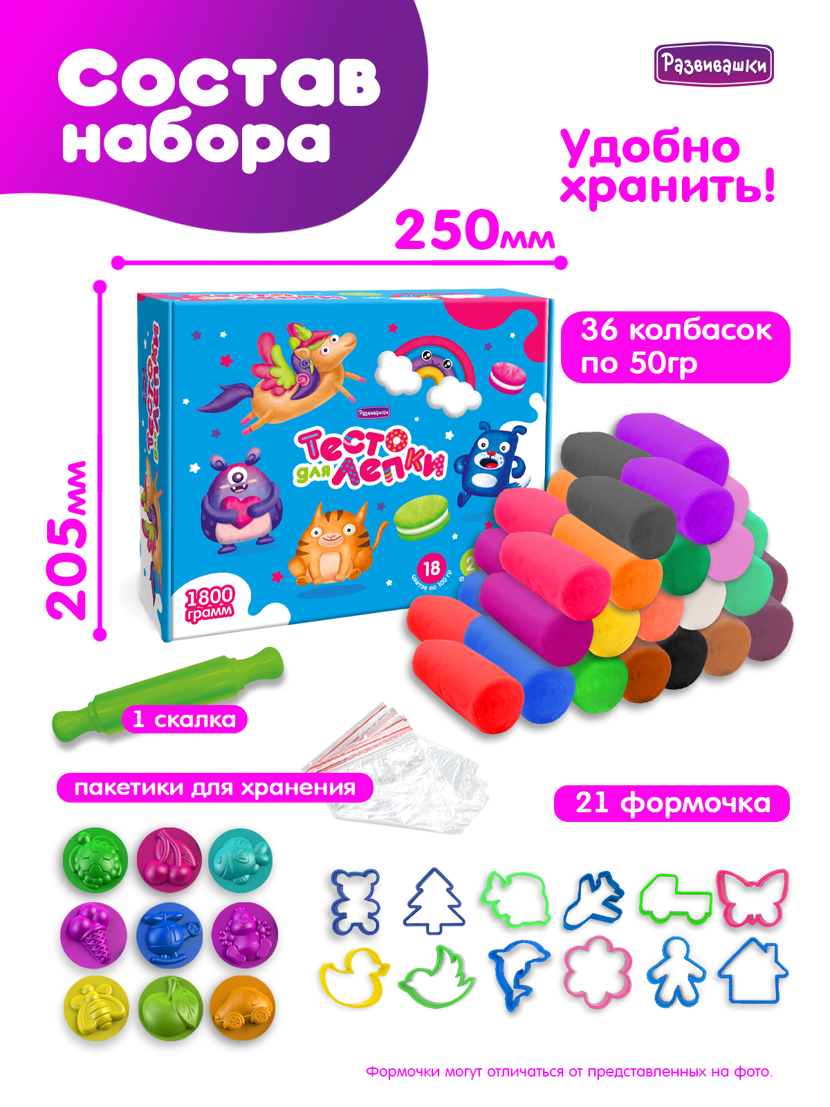 П133 Тесто для лепки в коробке, тесто 1800гр, 18 цветов (36 колбасок по 50 грамм), 21формочка, скалка, зип пакетики для хранения