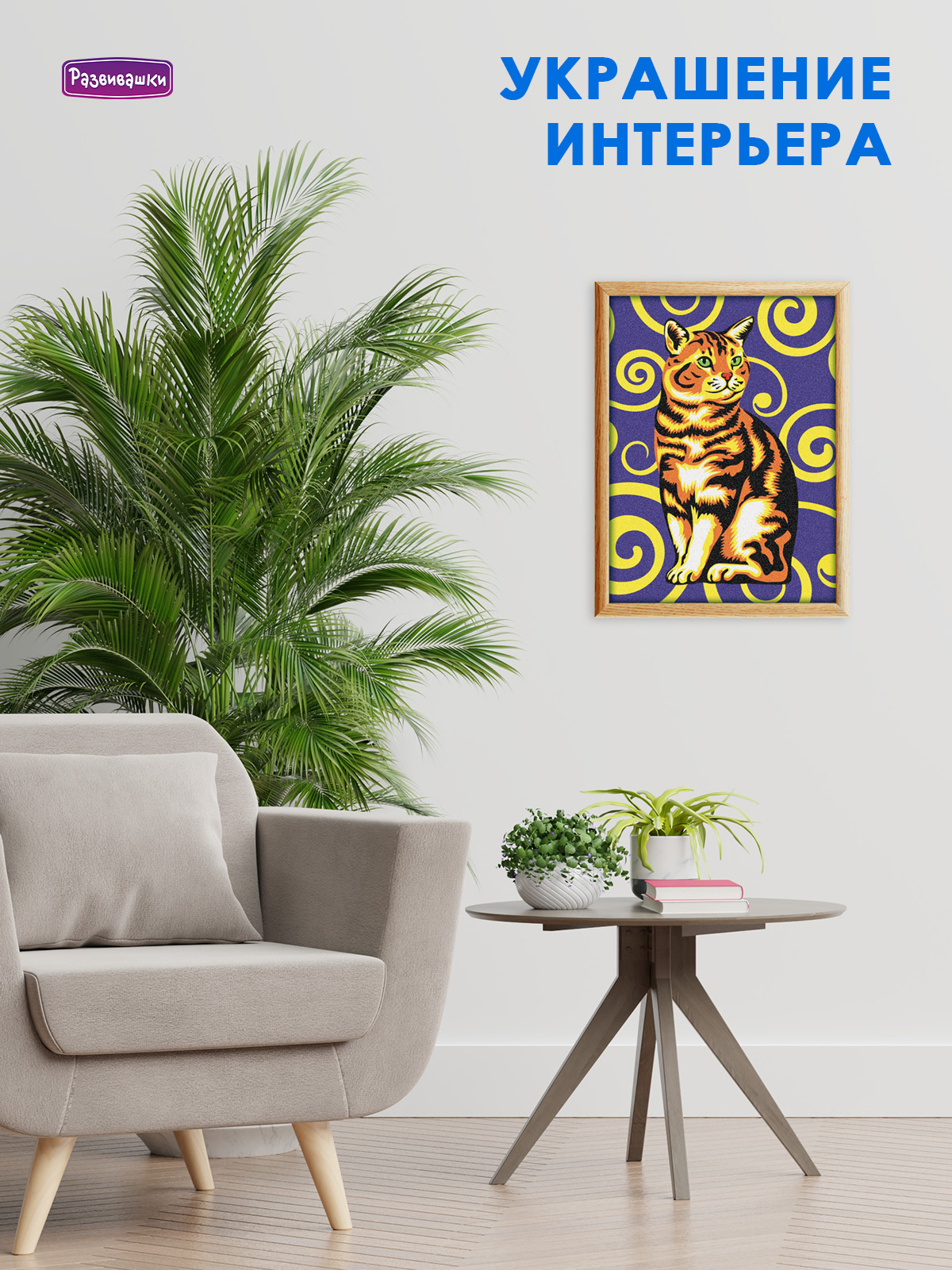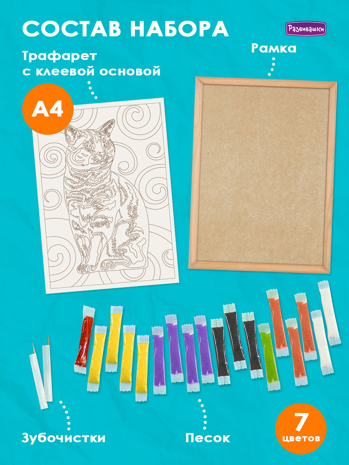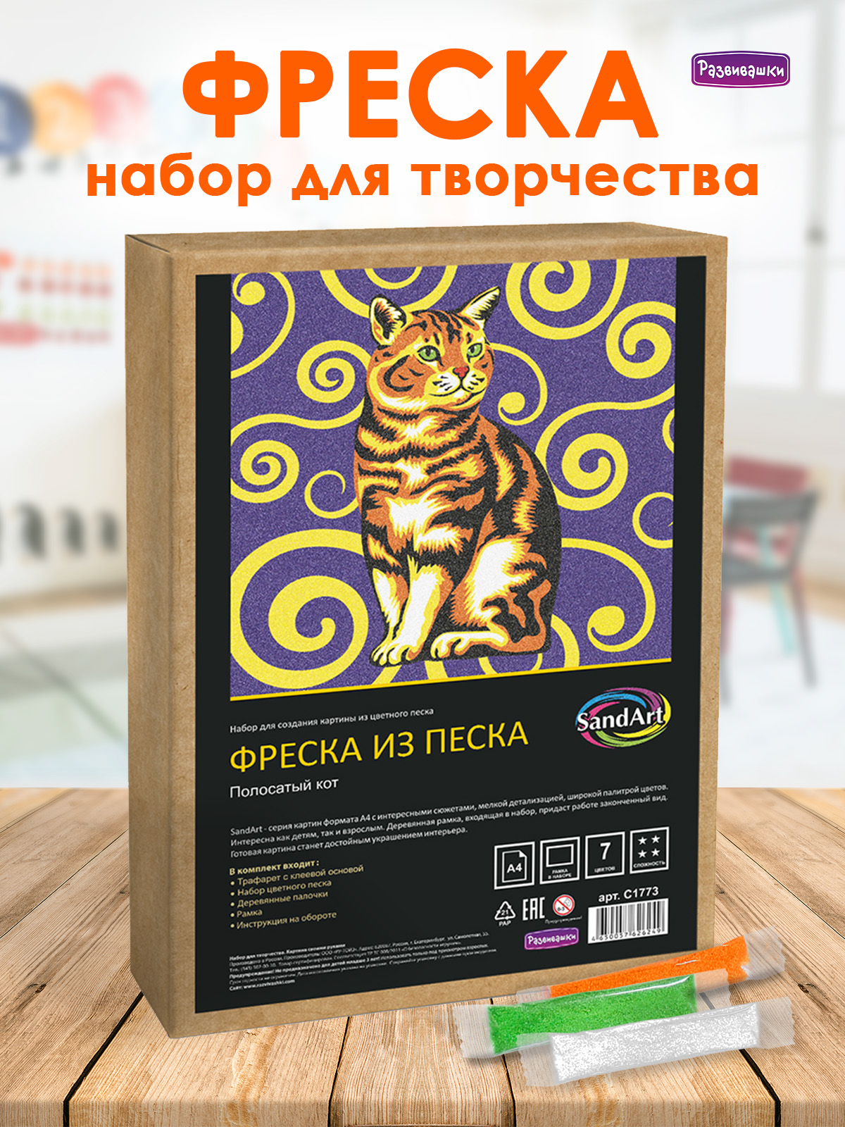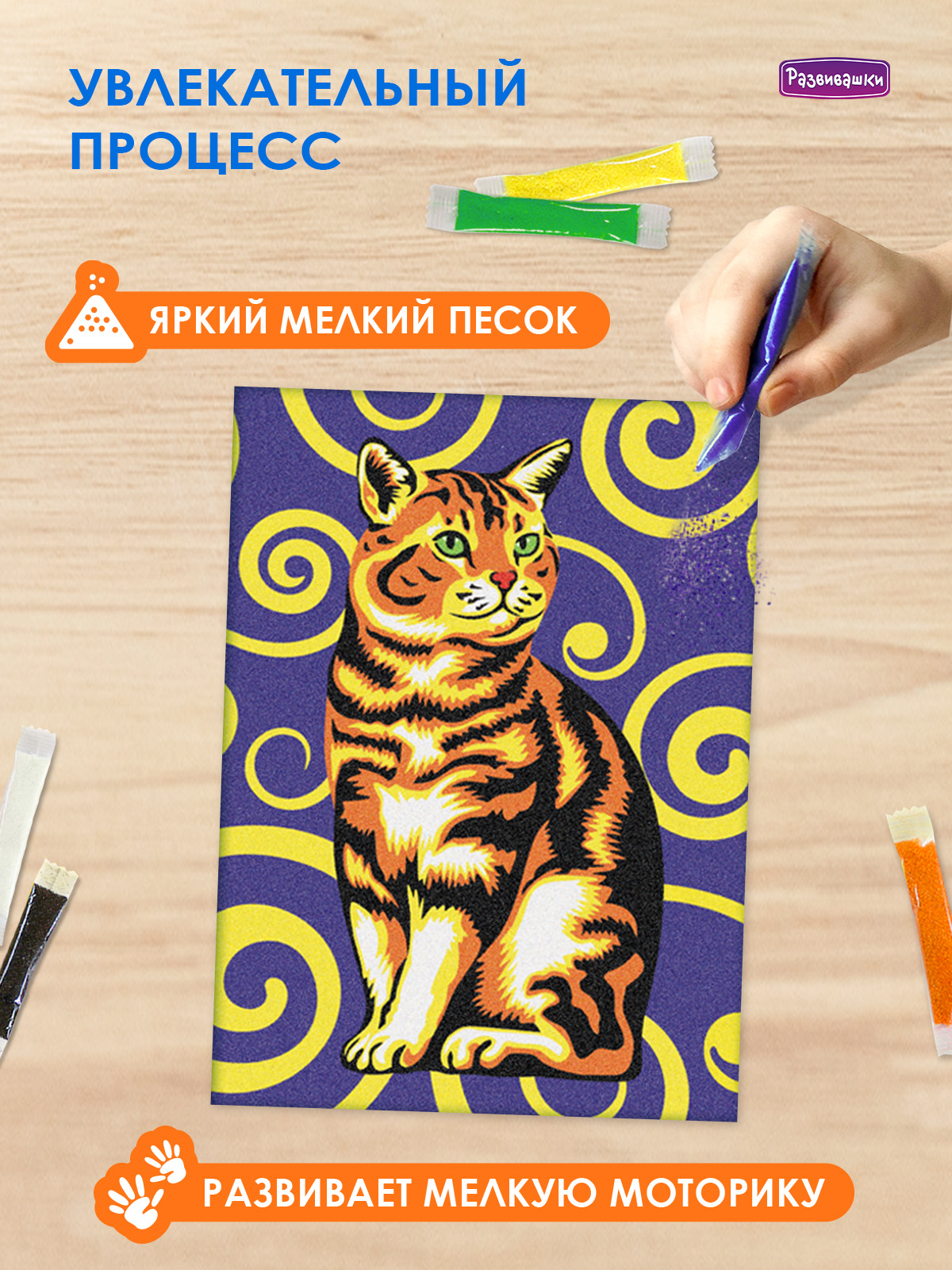 Home Фрески - роспись цветным песком Фрески большие 30х20 см С1773 Фреска из цветного песка А4 «Полосатый кот»