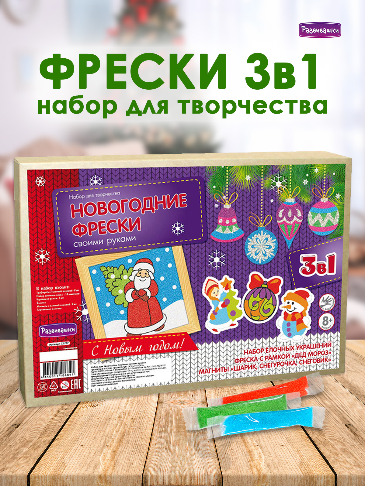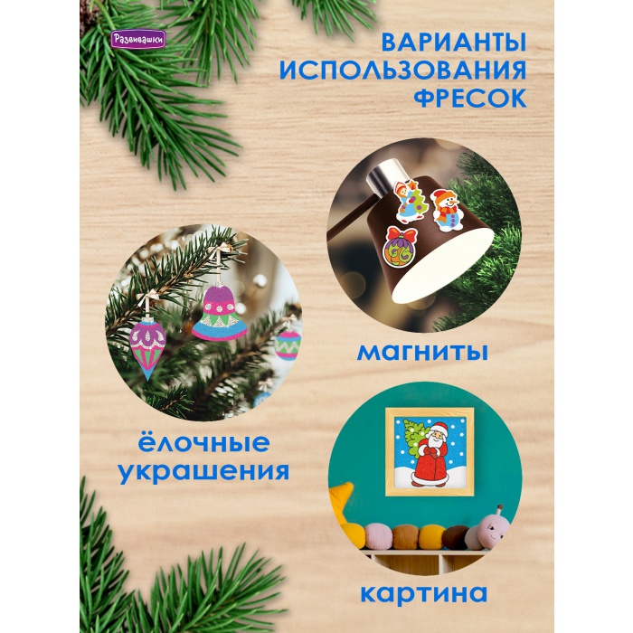 С1750 Фреска из цветного песка Магниты "Дед мороз, снежинка, елочка" /28 quantity